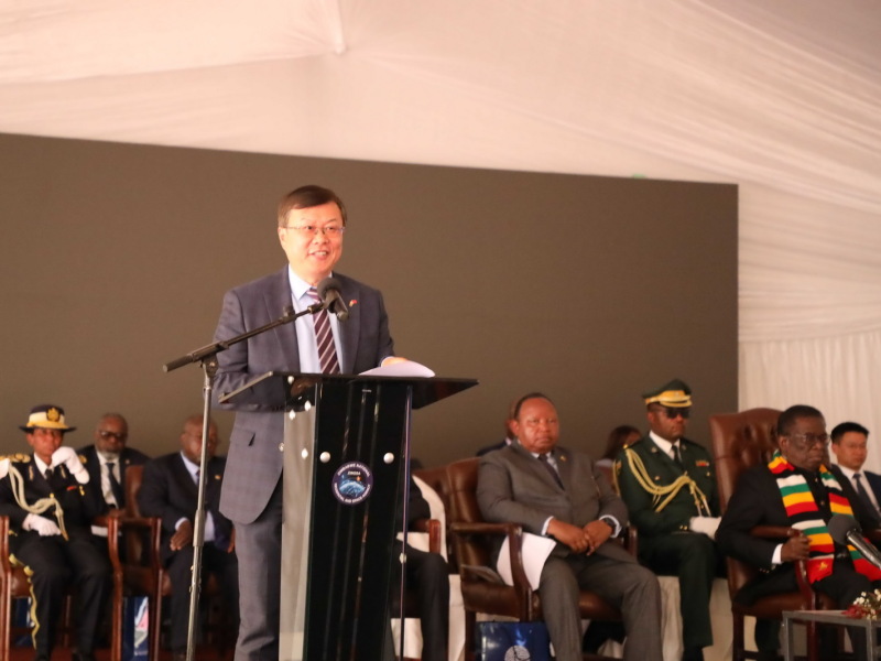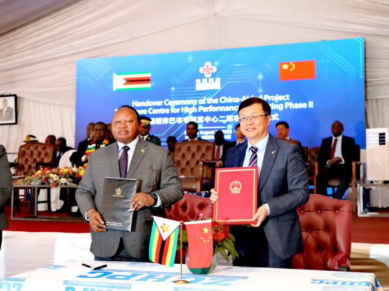 8月15日,驻津巴布韦大使周鼎出席中国援津超算中心二期项目交接仪式,津总统姆南加古瓦和高教部长沙瓦、技能考核部长马维马、哈拉雷省省长塔温古瓦及各界代表500余人出席仪式。